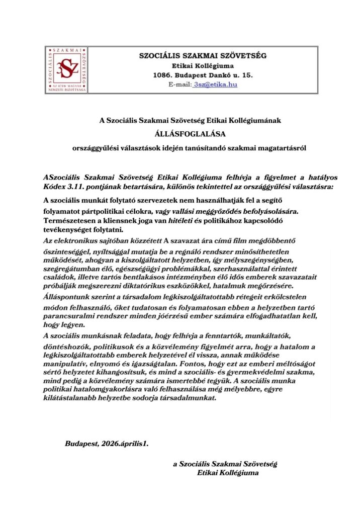 A Szociális Szakmai Szövetség Etikai Kollégiumának ÁLLÁSFOGLALÁSA országgyűlési választások idején tanúsítandó szakmai magatartásról A Szociális Szakmai Szövetség Etikai Kollégiuma felhívja a figyelmet a hatályos Kódex 3.11. pontjának betartására, különös tekintettel az országgyűlési választásra: A szociális munkát folytató szervezetek nem használhatják...